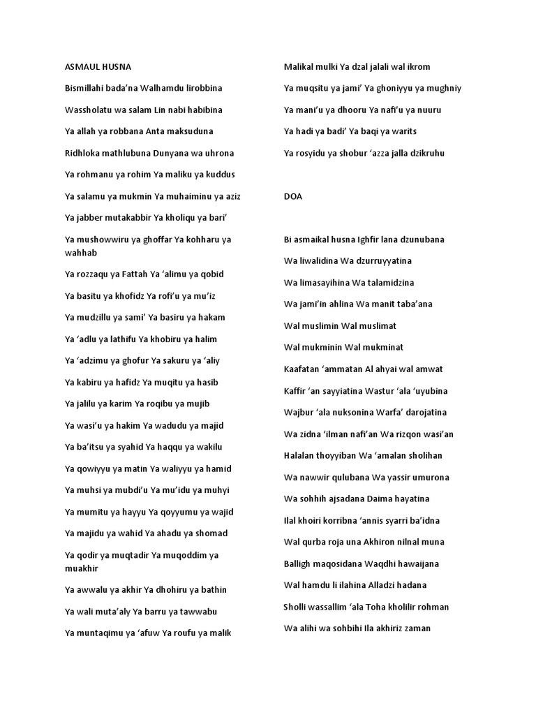 Teks nadhom asmaul husna latin arab dan terjemah indonesia yang berjumlah 99 nama asma allah teks asmaul husna latin. 100%(2)100% found this document useful (2 votes).